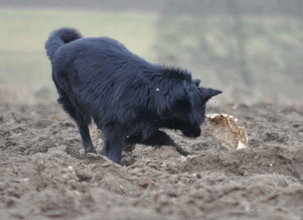 Wenn ich beim Spaziergang kein Spielzeug dabei habe und Merlin kein Stöckchen findet, dass er tragen kann sucht er sich irgendetwas anderes. Ihm ist völlig egal womit er spielt, egal ob es ein Handschuh ist den jemand verloren hat oder einfach eine alte Plane - Haupsache Action