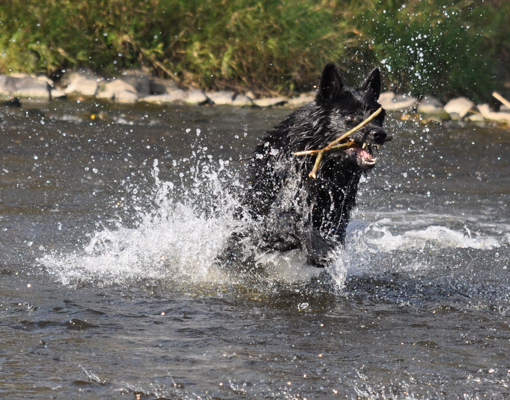 Er hat einen Stock entdeckt und springt ins Wasser.