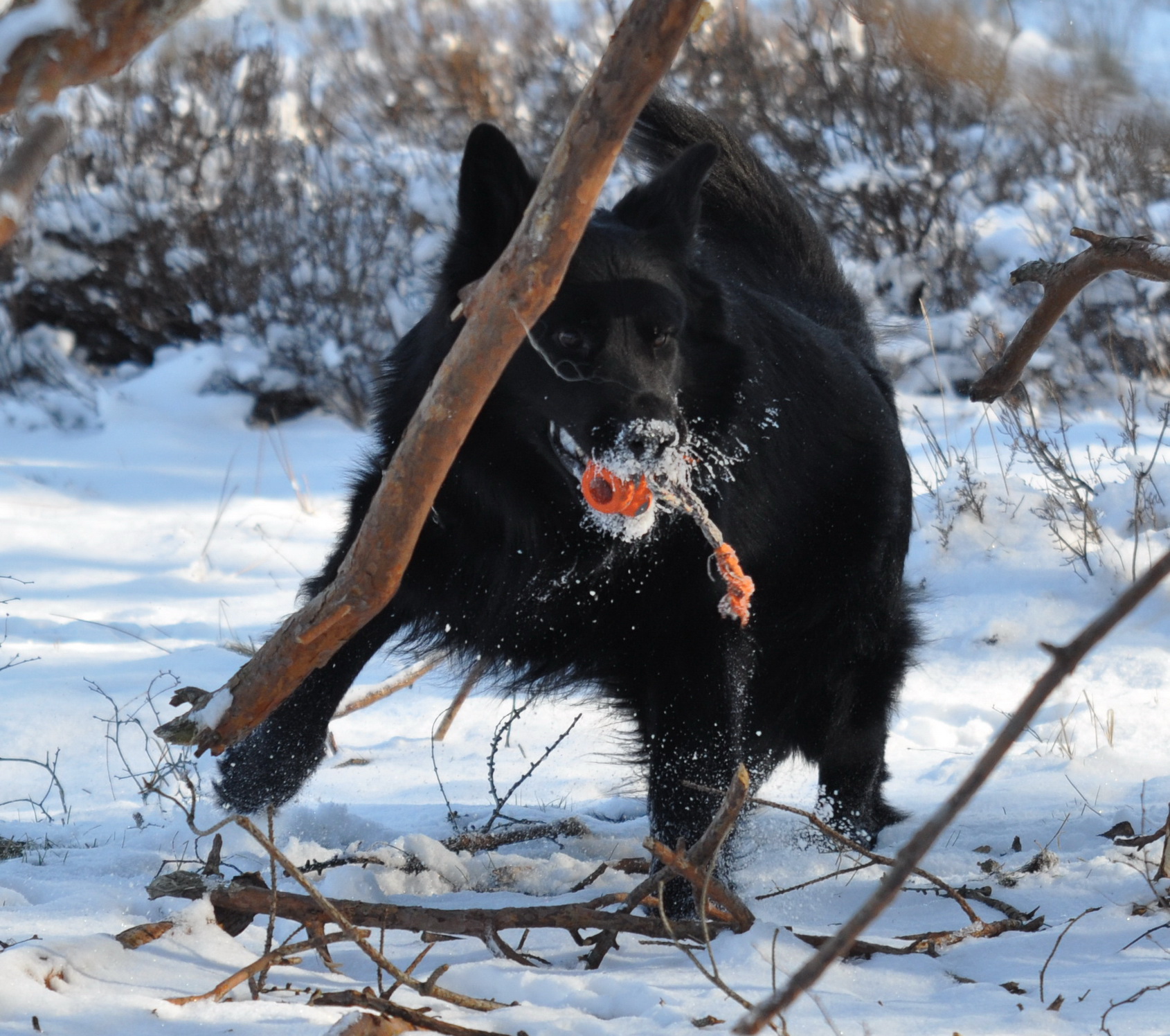 Merlin kämpft sich durch das Gestrüpp und den Schnee. An der Kenndecke ist übrigens ein Glöckchen befestigt. Während der Suche entfernen sich die Hund oft außer Sichtweite, so habe ich die Möglichkeit zumindest zu hören wo Merlin in etwa ist. Extreme Vorteile bringt das natürlich im Dunkeln, da werden zwar zusätlich noch kleine Leuchtdioden an der Kenndecke befestigt, die sieht man aber schon nicht mehr, wenn der Hund hinter dem nächsten Gebüsch verschwunden ist.